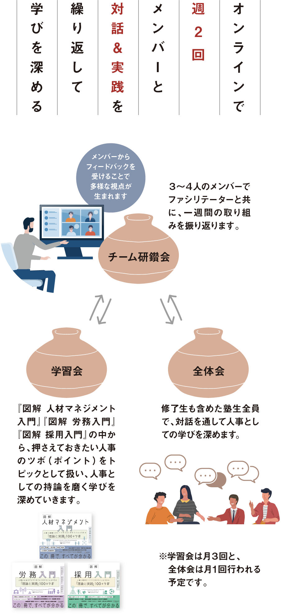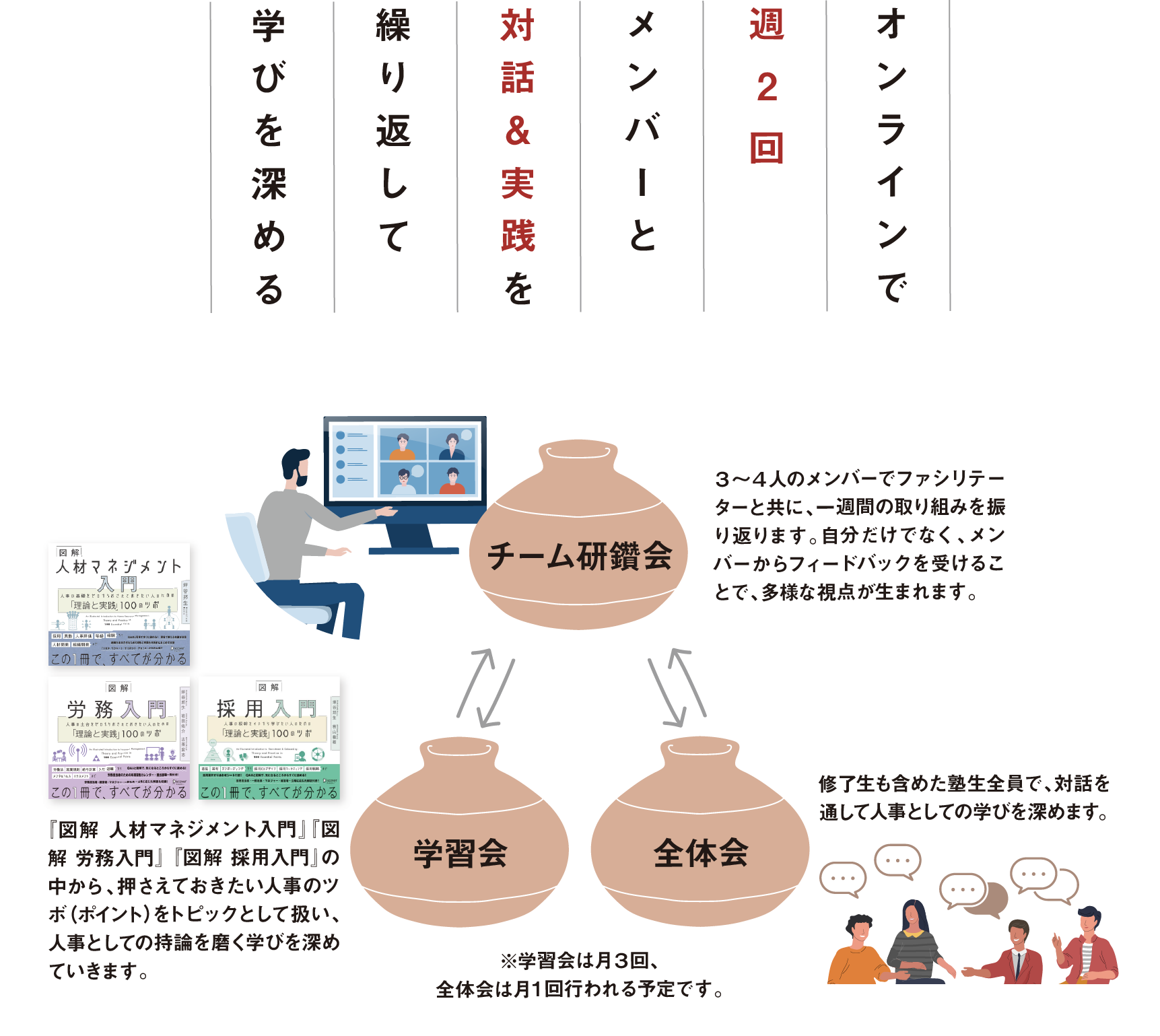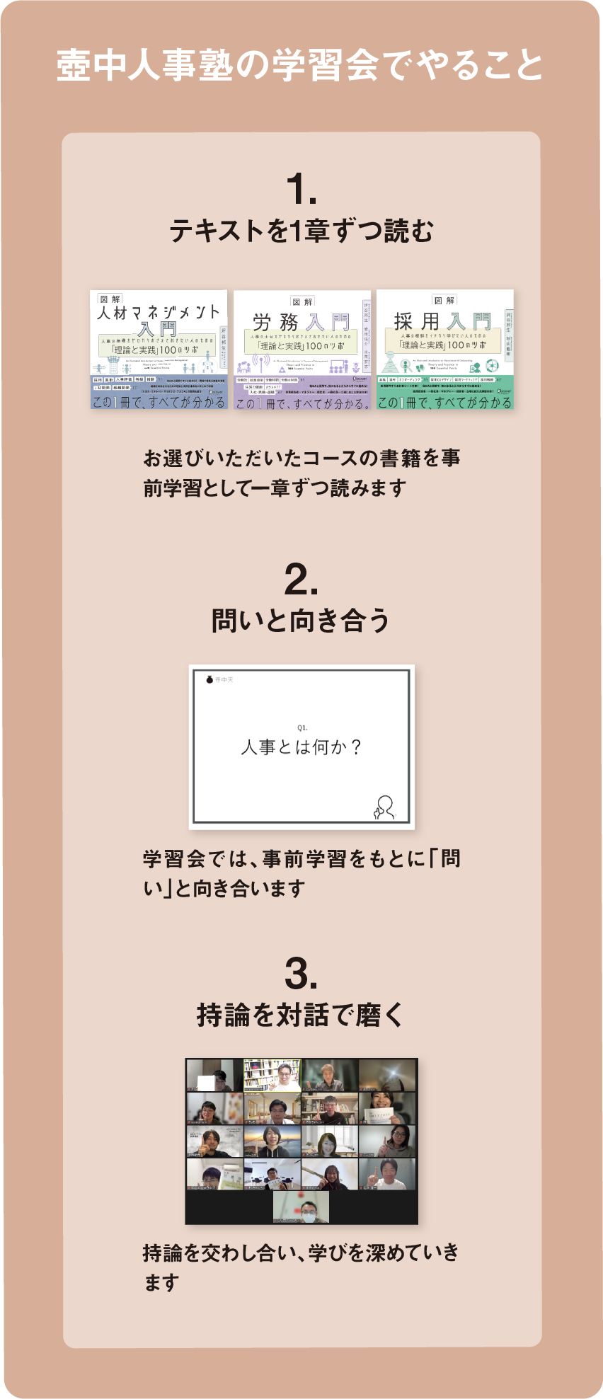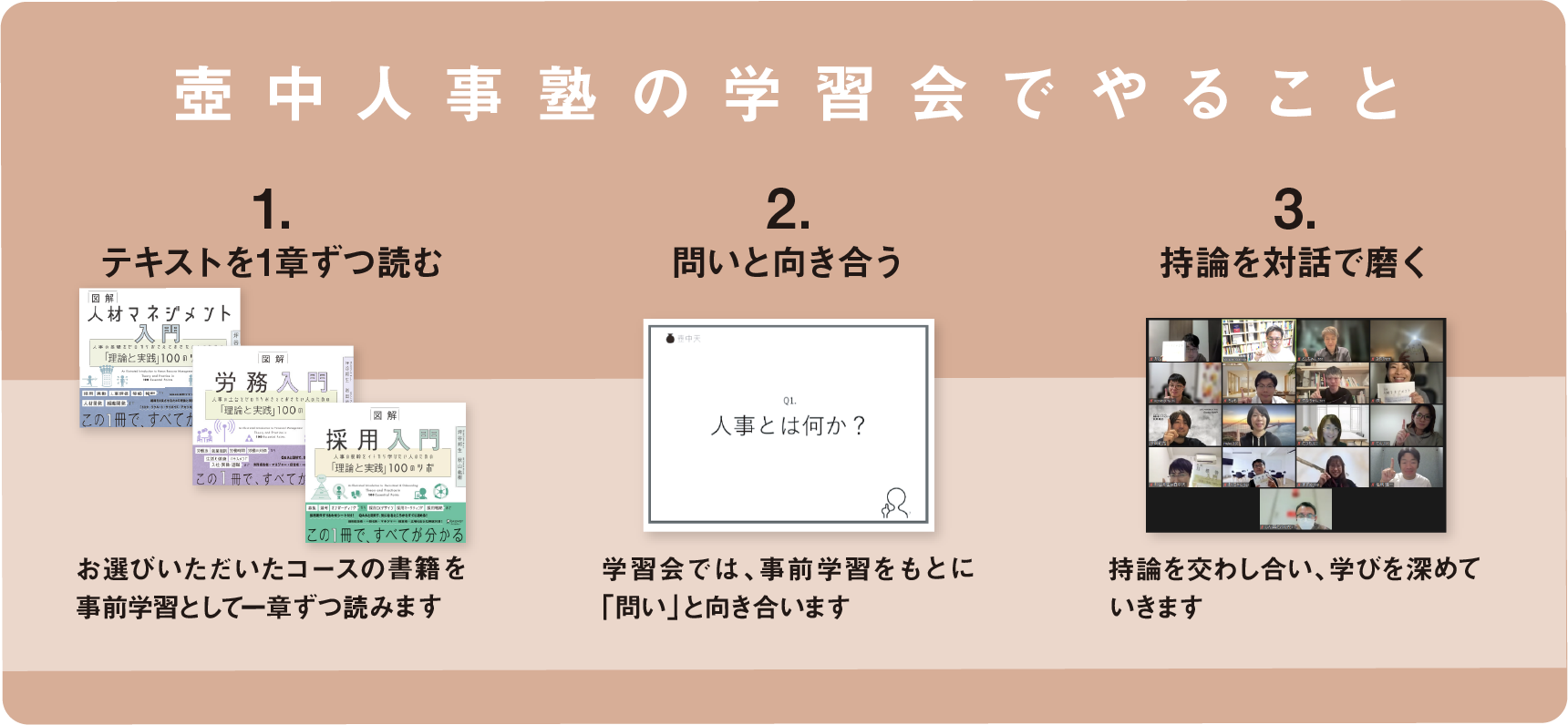 壺中人事塾は、人事のプロフェッショナルを目指す方々と共に研鑽を積む場ですので、スタート地点に居る方、長く道を歩んできた方も共に学び合う姿勢があれば問題ありません。