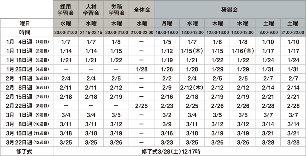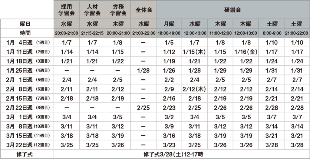※受講者数が各曜日ごとに3人集まらない場合は、開催が難しい場合があります。